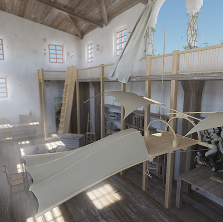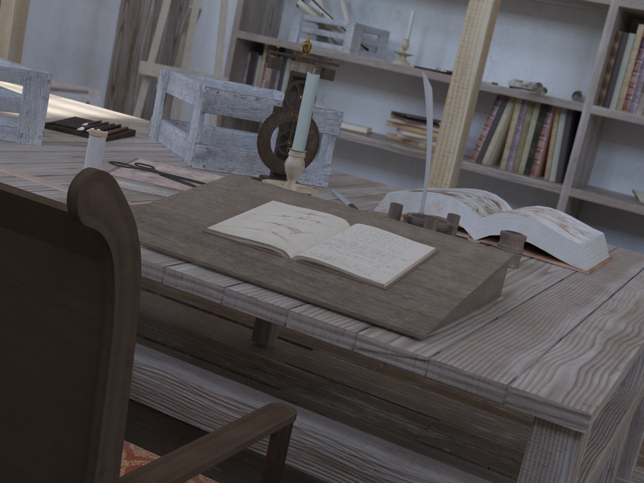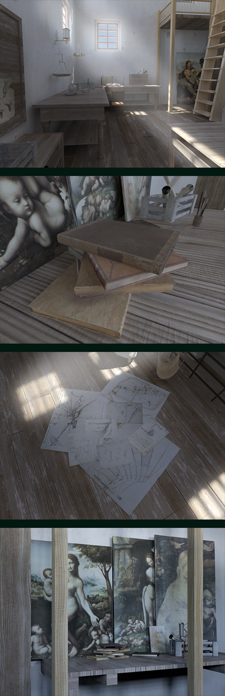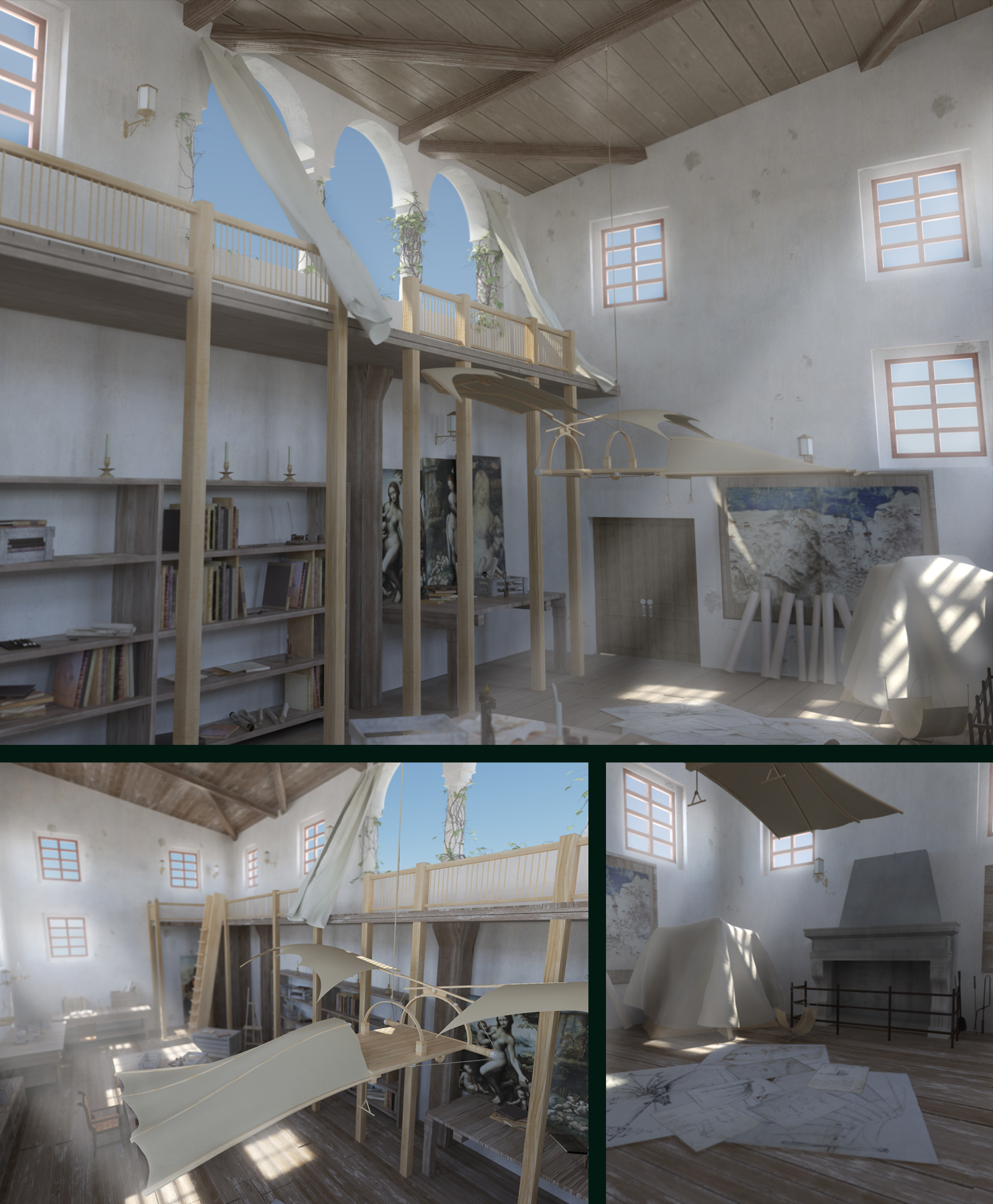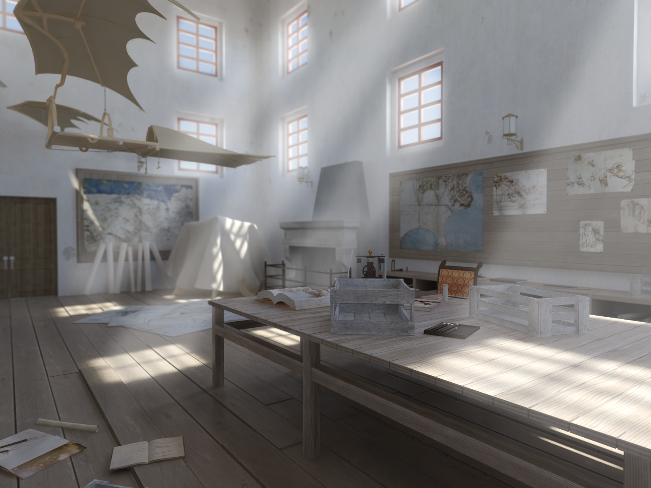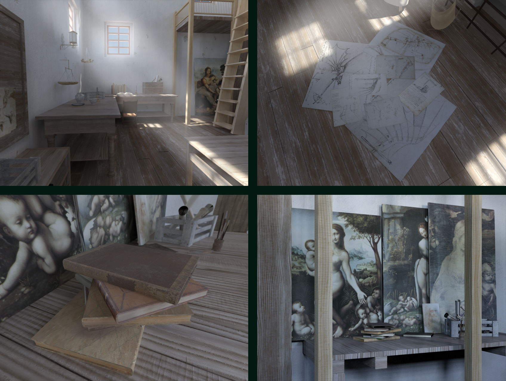 W naszym portfolio nie brakuje projektów wykonanych z pasji. Tak też powstał warsztat Leonarda da Vinci. To wizualna interpretacja jego pracowni, gdy mistrz mógł być u kresu życia, dlatego znajdziemy w niej dzieła z późniejszych okresów jego tworzenia. Materiały na temat tego twórcy ukazują go zwykle jako wielkiego maestra. Nie każdy jednak wie, że miał wiele przywar np. zamiłowanie do nieporządku. W koncepcji warsztatu panuje zatem chaos i umiarkowane niedbalstwo: porozrzucane książki, szkice, ryciny, skrzynki na narzędzia czy nierówna podłoga.