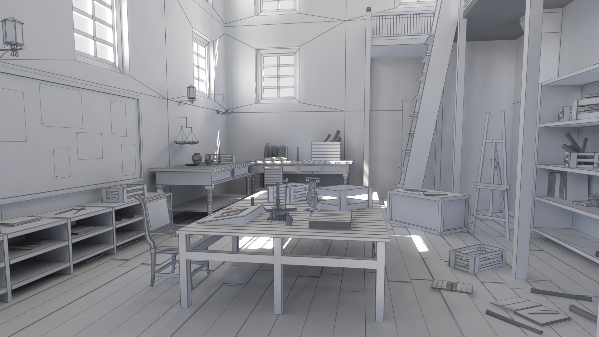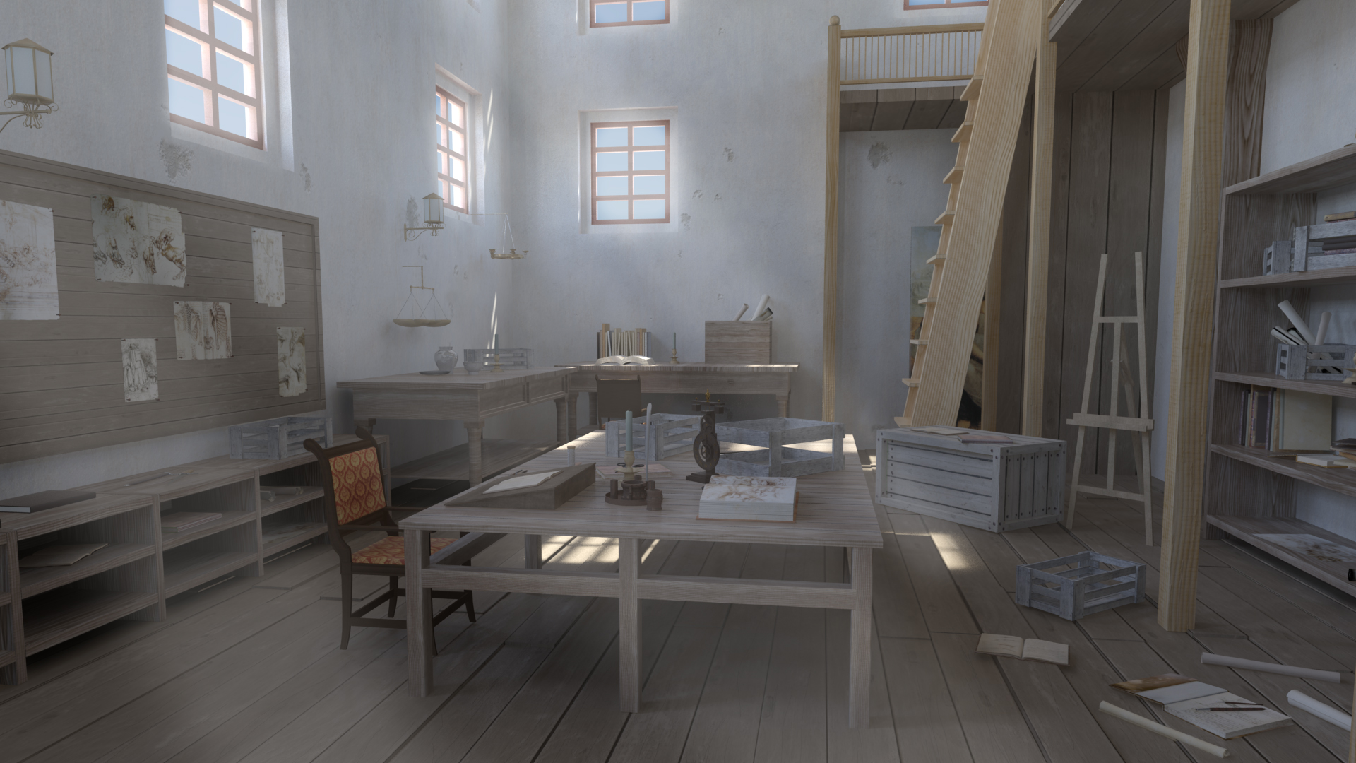 W naszym portfolio nie brakuje projektów wykonanych z pasji. Tak też powstał warsztat Leonarda da Vinci. To wizualna interpretacja jego pracowni, gdy mistrz mógł być u kresu życia, dlatego znajdziemy w niej dzieła z późniejszych okresów jego tworzenia. Materiały na temat tego twórcy ukazują go zwykle jako wielkiego maestra. Nie każdy jednak wie, że miał wiele przywar np. zamiłowanie do nieporządku. W koncepcji warsztatu panuje zatem chaos i umiarkowane niedbalstwo: porozrzucane książki, szkice, ryciny, skrzynki na narzędzia czy nierówna podłoga.
